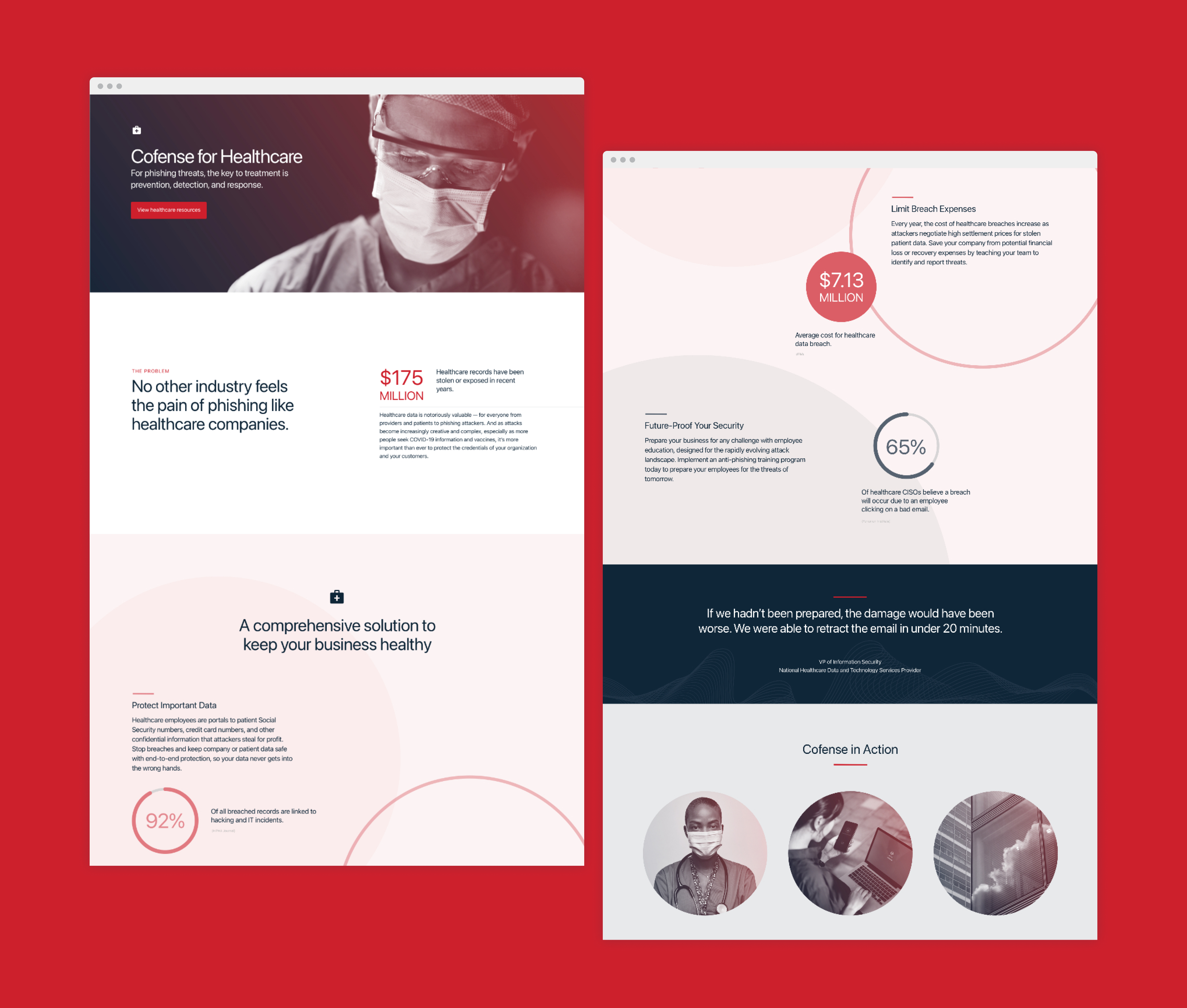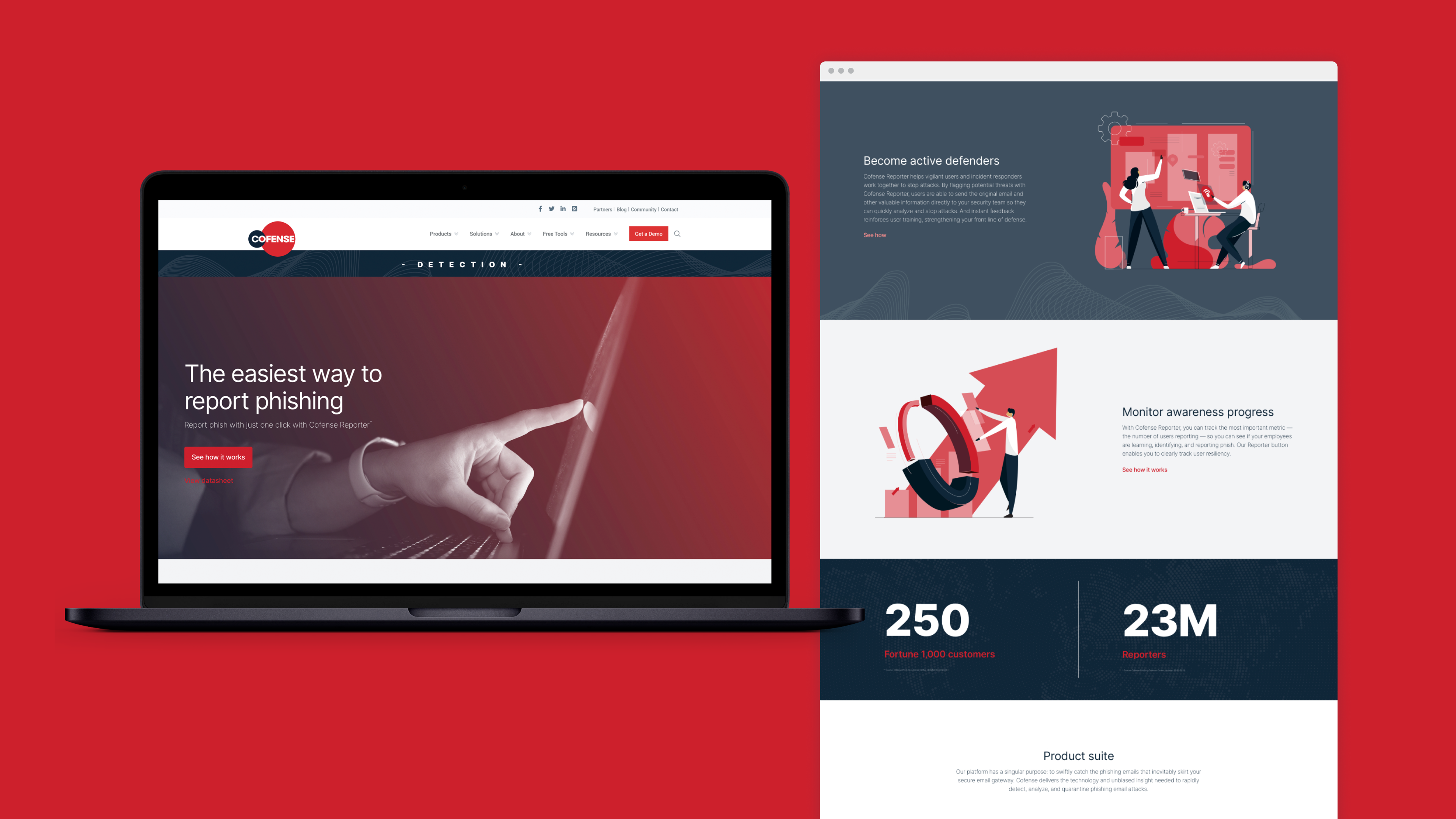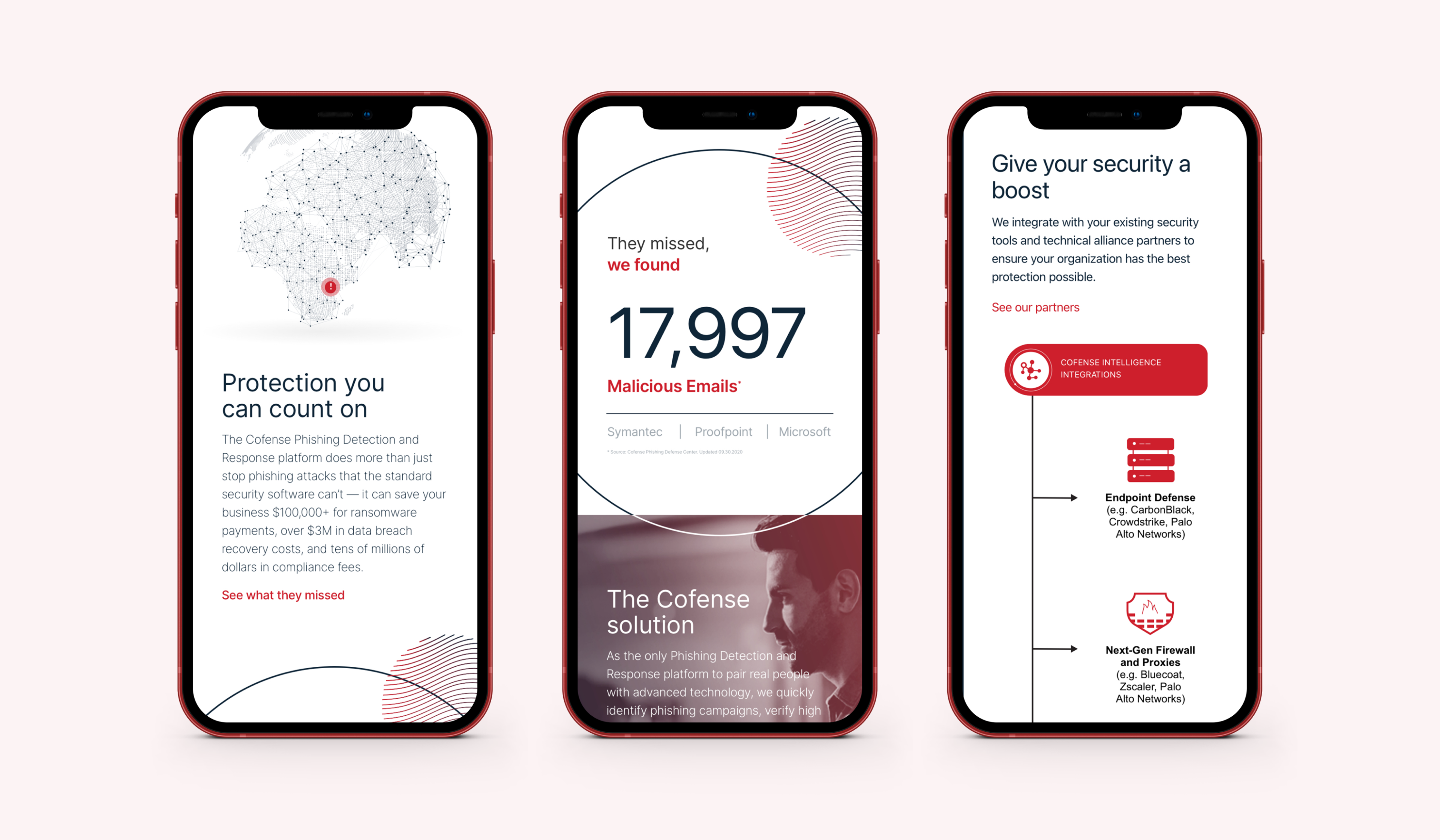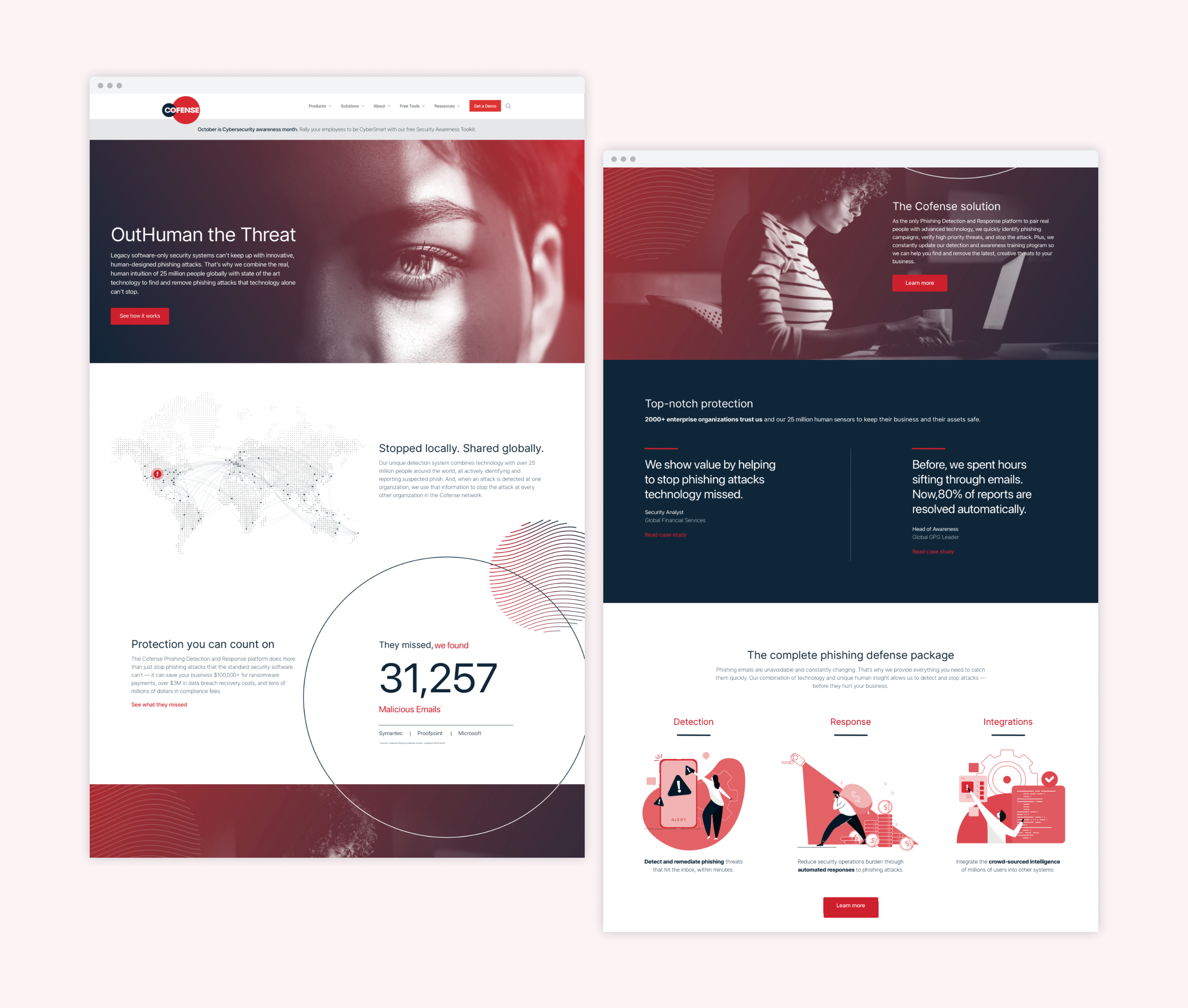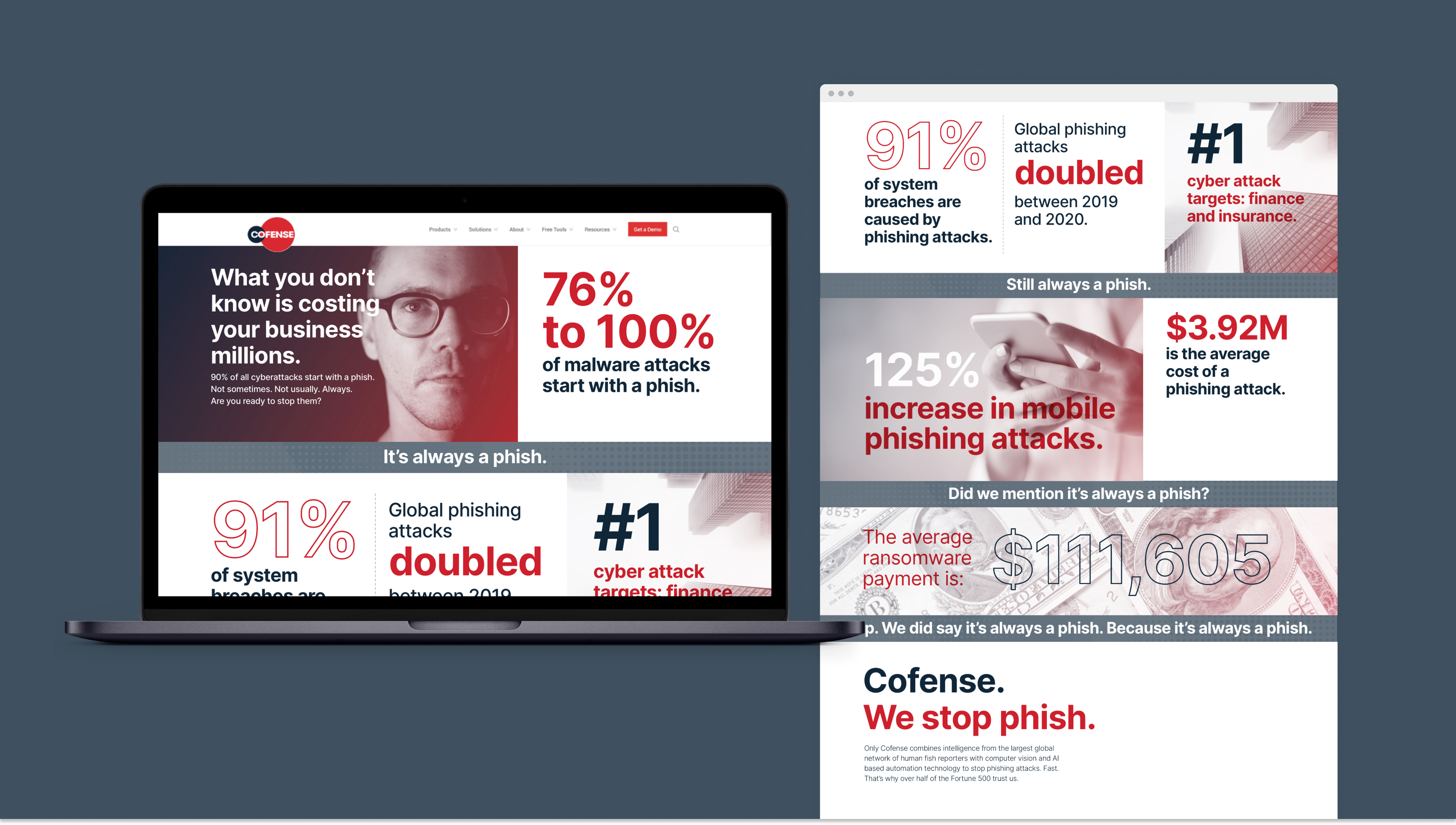 Looking to differentiate themselves as the leader in protection, detection, and response email security solutions, Cofense asked JMS to recast their brand in the growing data security market. Through internal interviews, market research, and a deep study into company technology and processes, we arrived at the positioning of “out-humaning the threat,” and brought the language to life through design, website content, and a campaign launch to reintroduce Cofense as a formidable opponent to phishing schemes at every level.