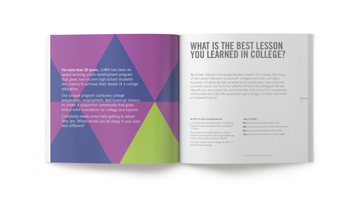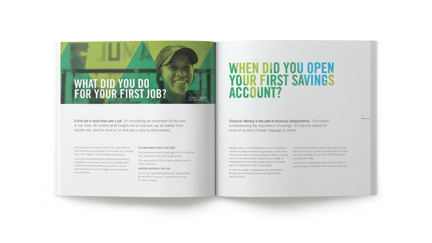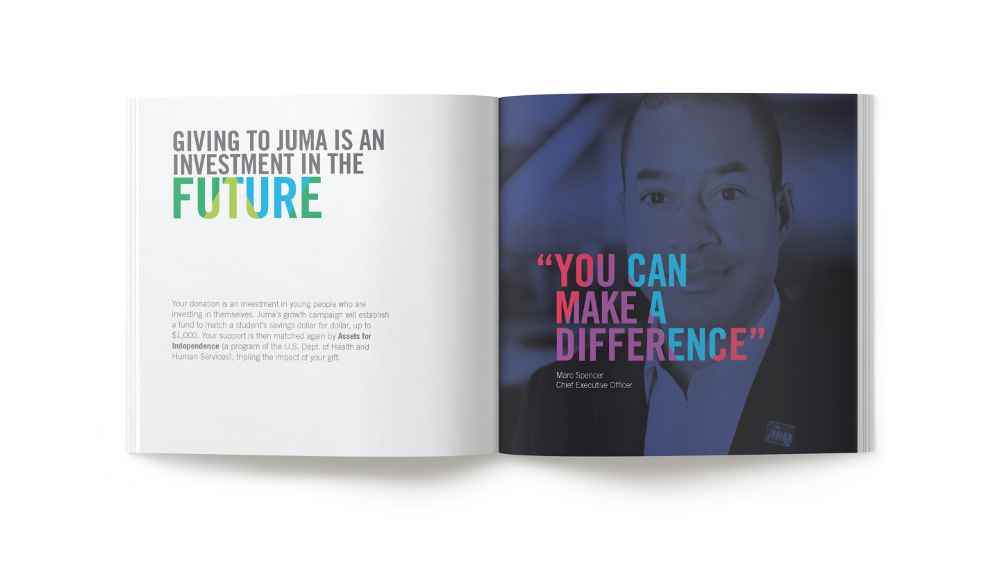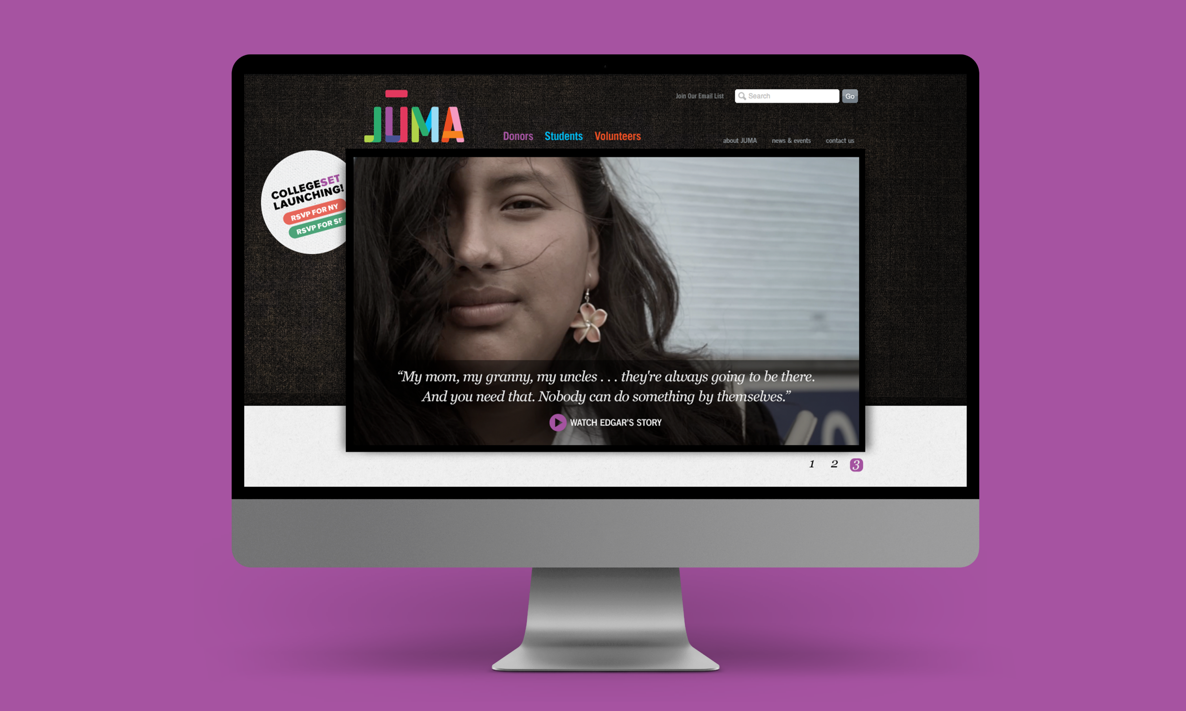 Since 1993, Jūma has empowered thousands of underserved teens in building the future of their dreams through its practical, actionable services. They aid teenagers in finding a job, setting up a bank account, and offering financial counseling and support as they cross the critical growth period of high school into college. Their team had been doing this important work for years, but the branding and marketing wasn’t adequately substantiating their mission and output. Enter JMS, who set to work building Jūma a new identity and supporting collateral, inspiring web experience, and a marketing program featuring Jūma students sharing their personal, insightful stories. JMS focused on elevating the brand with its most inspiring asset—the incredible, hardworking individuals whose lives have been changed by their relationship with Jūma. The result was something bright, hopeful, and hard to ignore—just like the teenagers they serve.