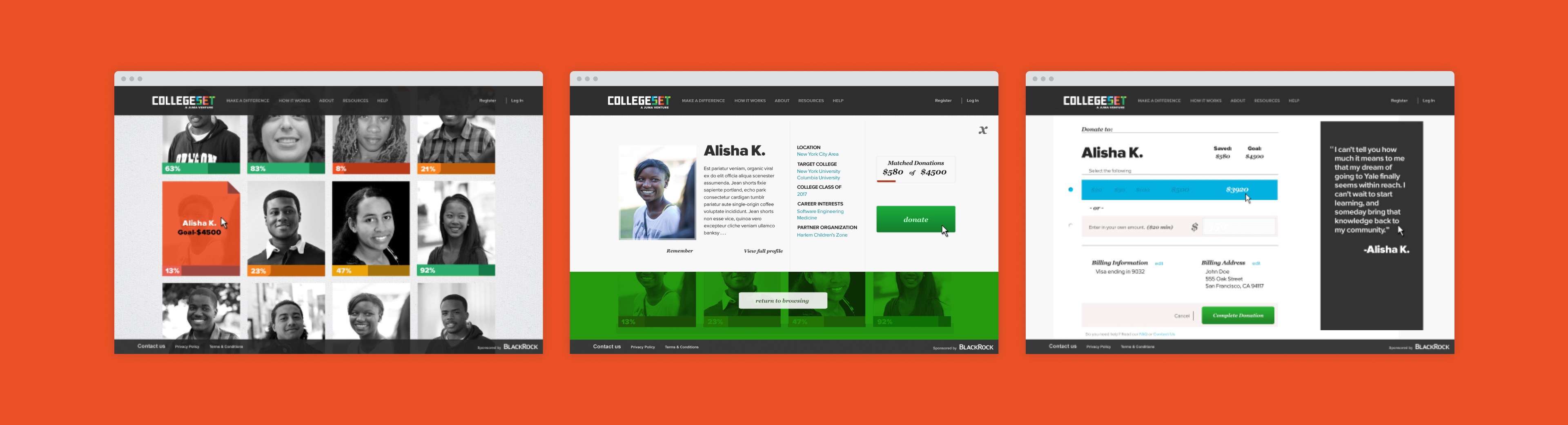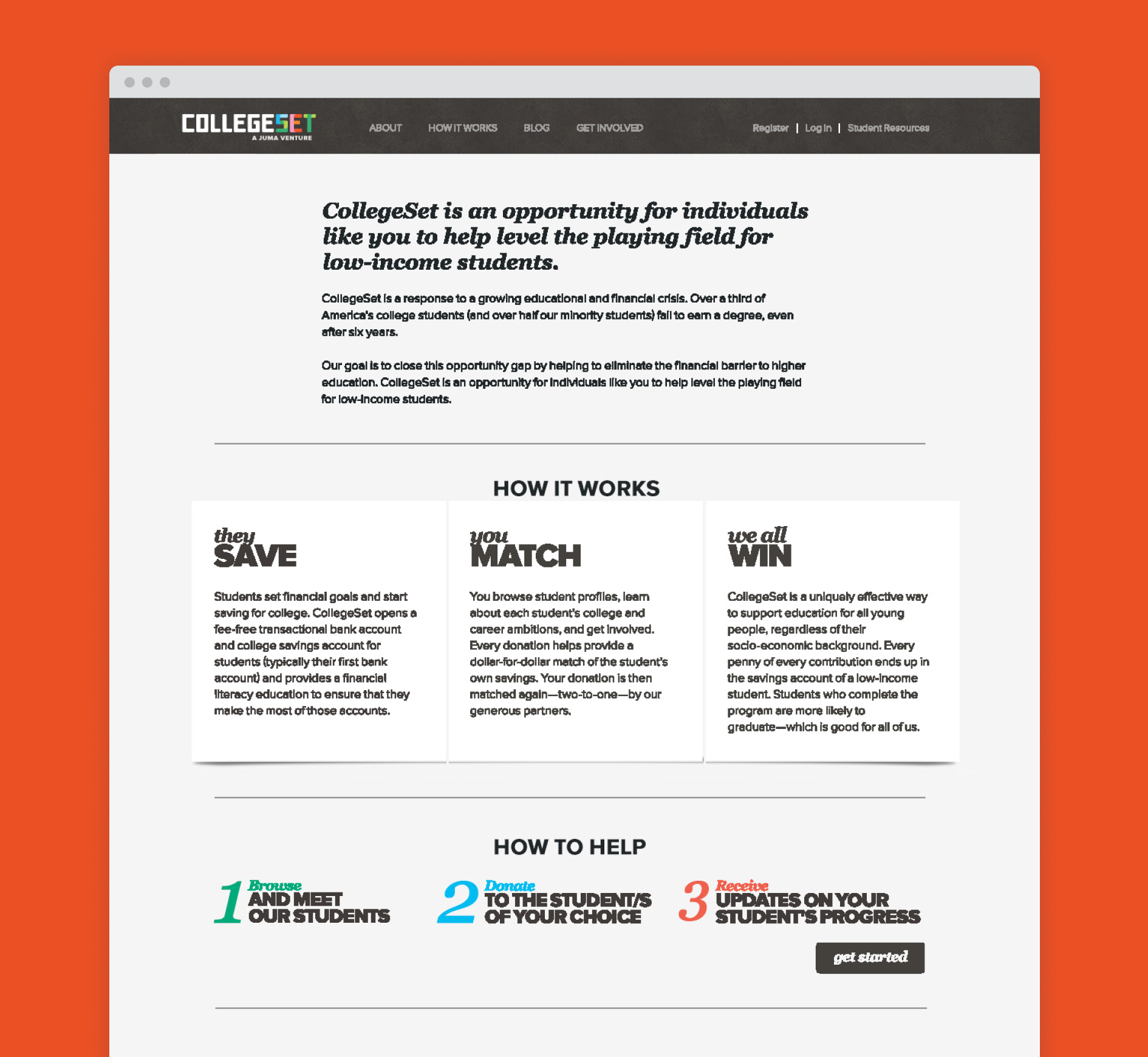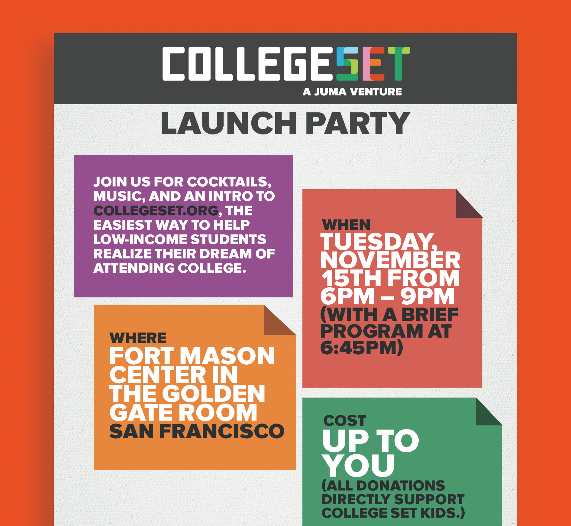 Due to the strength of success in Juma’s rebrand, their team awarded JMS the project of designing a crowdfunding website for their venture College Set. This sub-venture lets community members donate funds to students getting ready to start college.