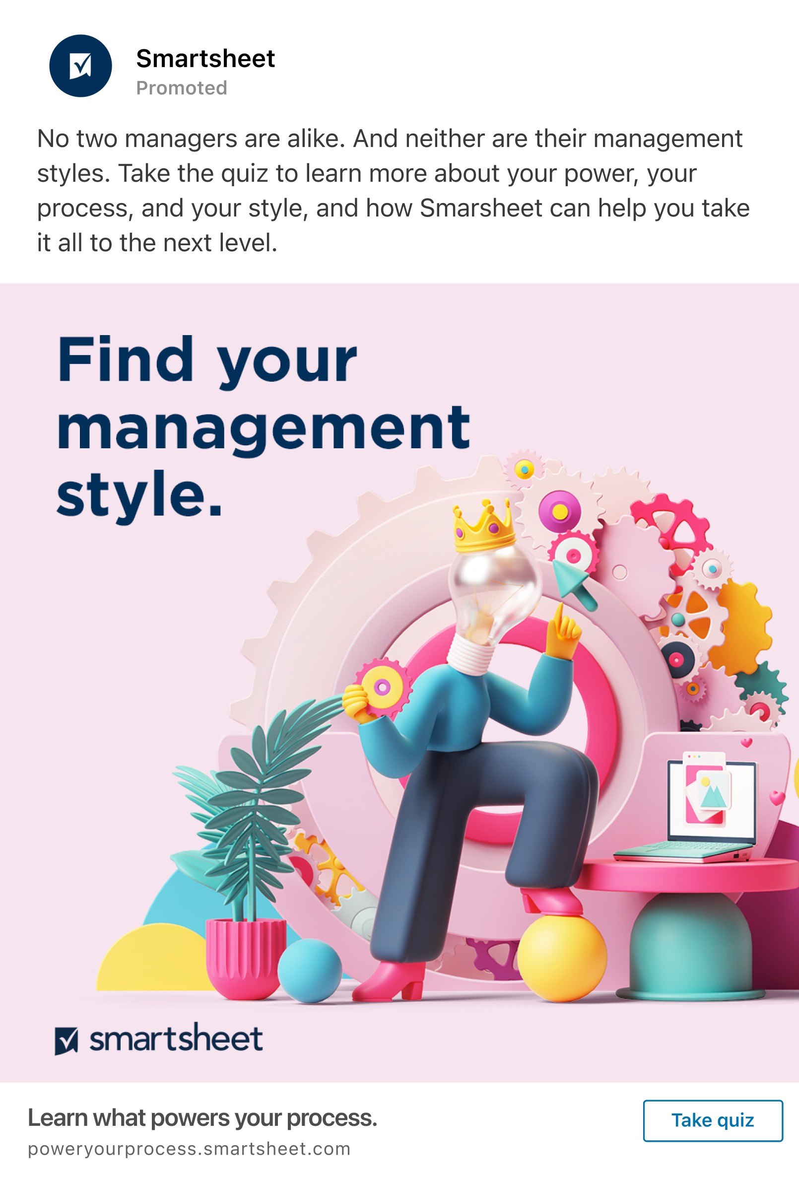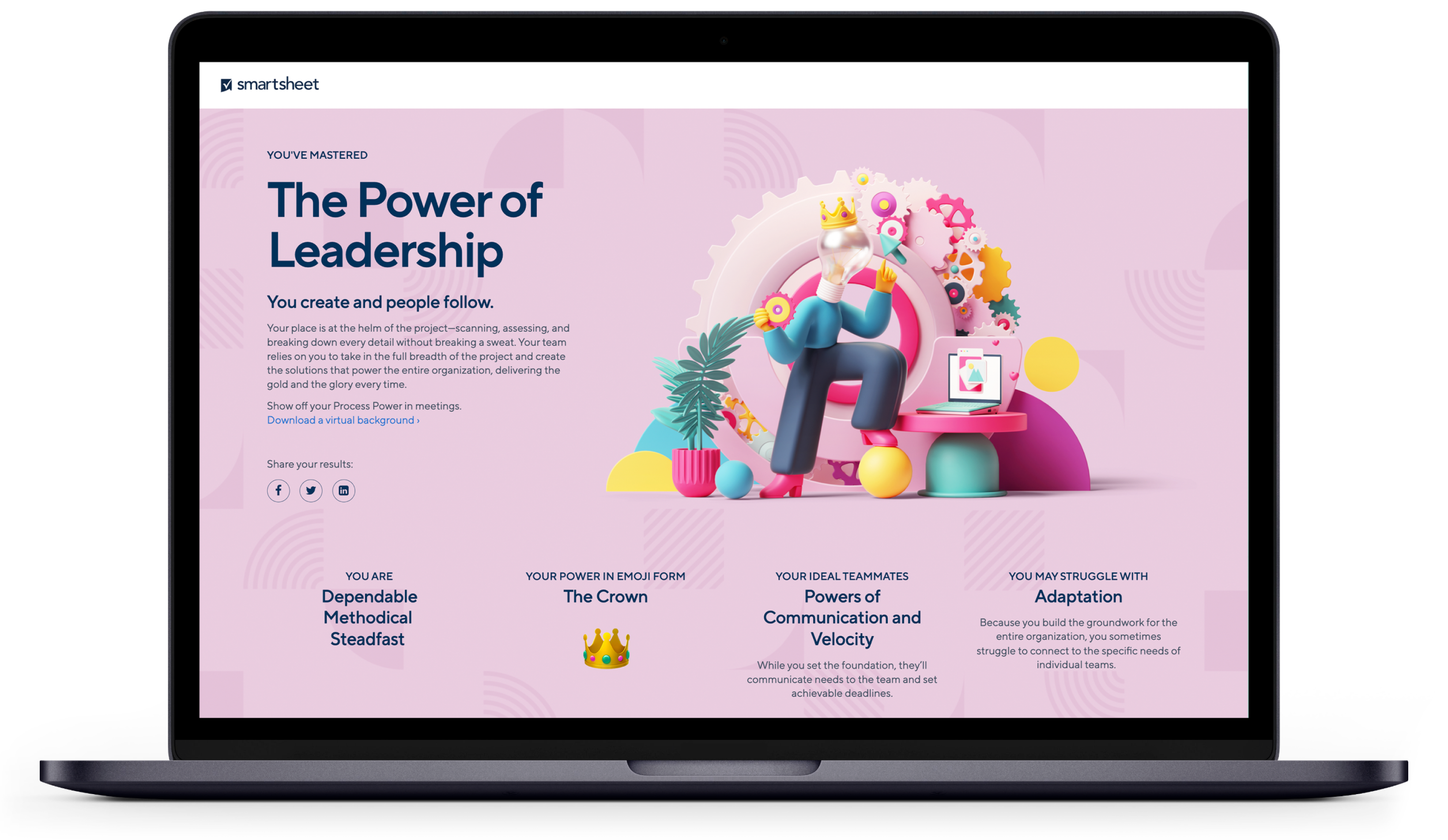 At the same time, Smartsheet wanted to learn more about the different personas of their users, their strengths, motivations, and management styles. We partnered with them to turn the research study into a fun and engaging interactive quiz that tied into the product campaign by revealing each person’s strengths or “powers of process’. We created a series of custom illustrations for each unique power. Targeted social posts, animations, and videos prompted customer engagement with the quiz.